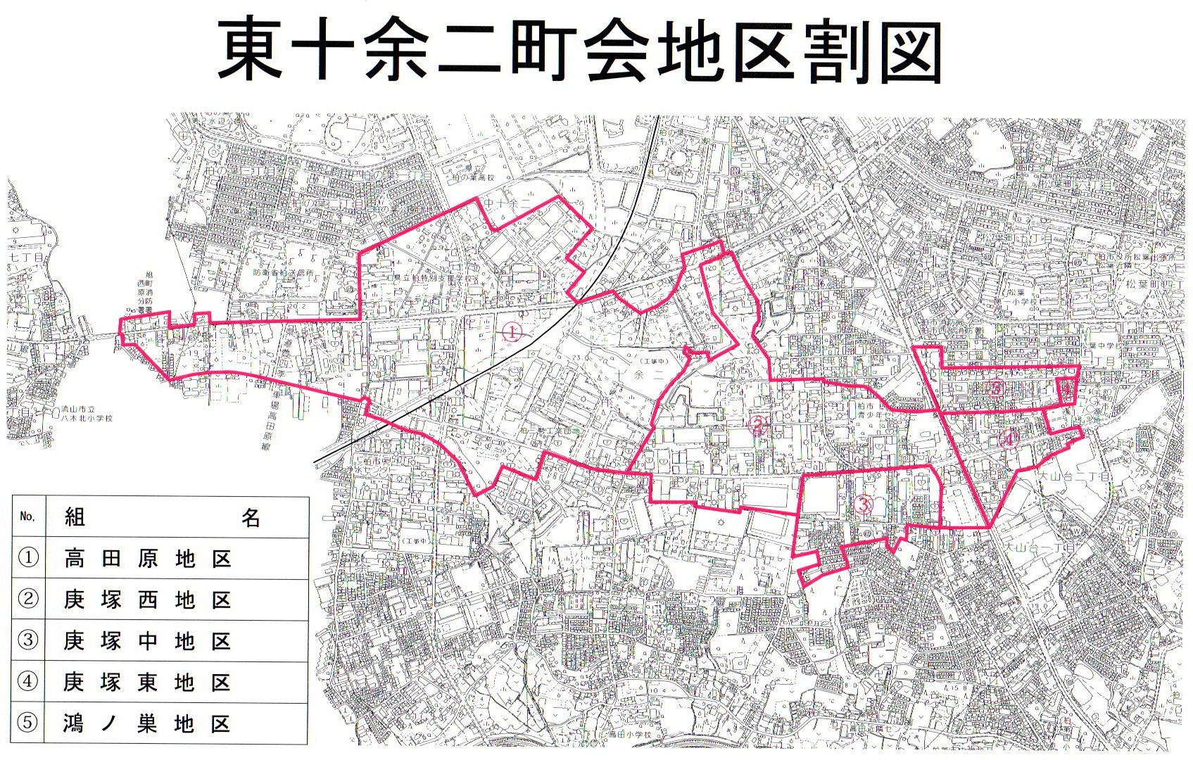 当町会は高田原・西・中・東・鴻ノ巣地区に分かれています(五地区)